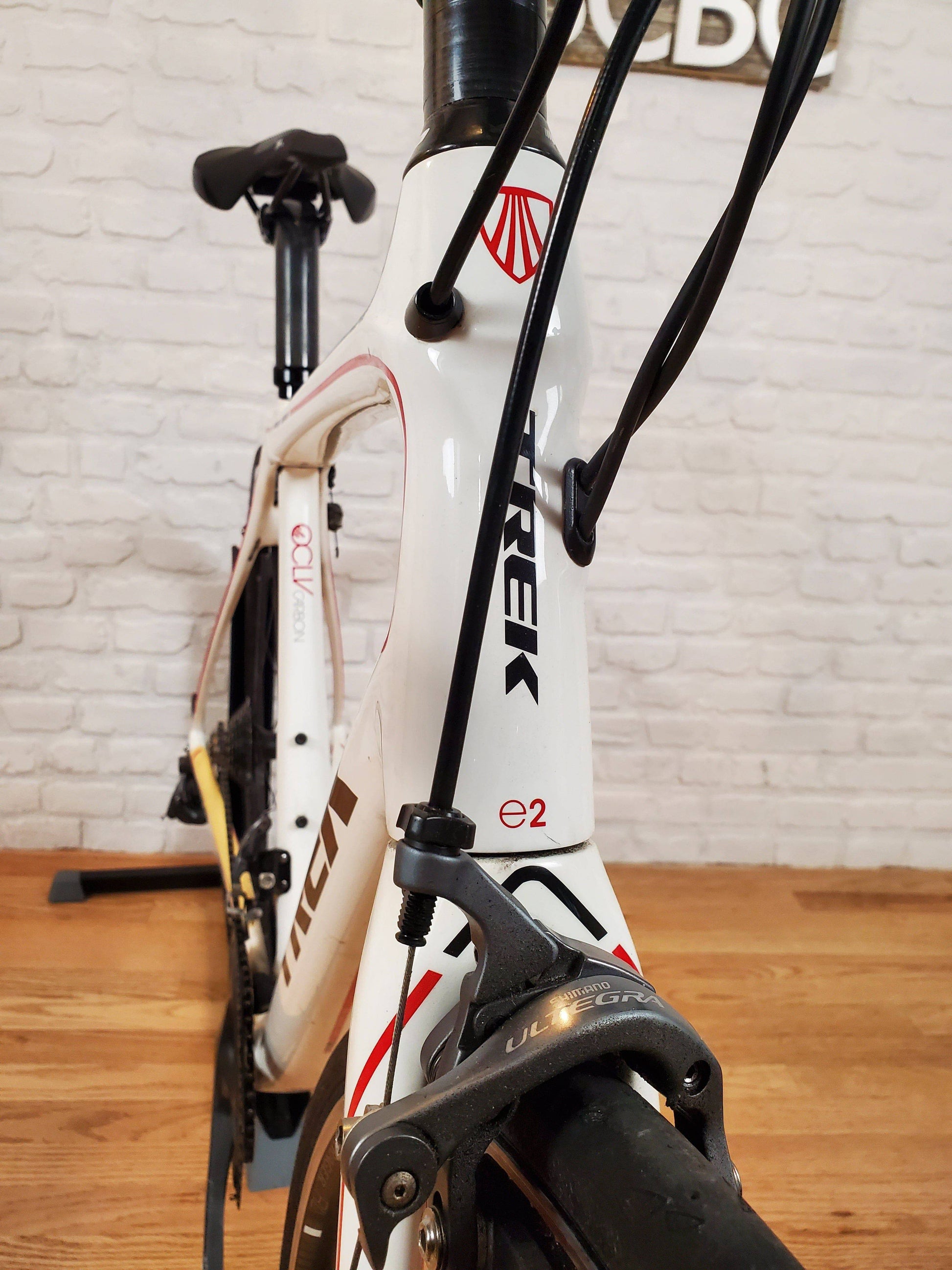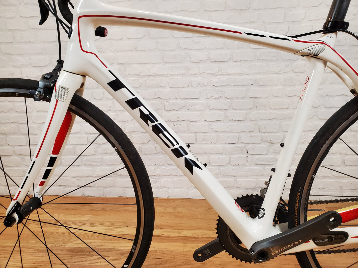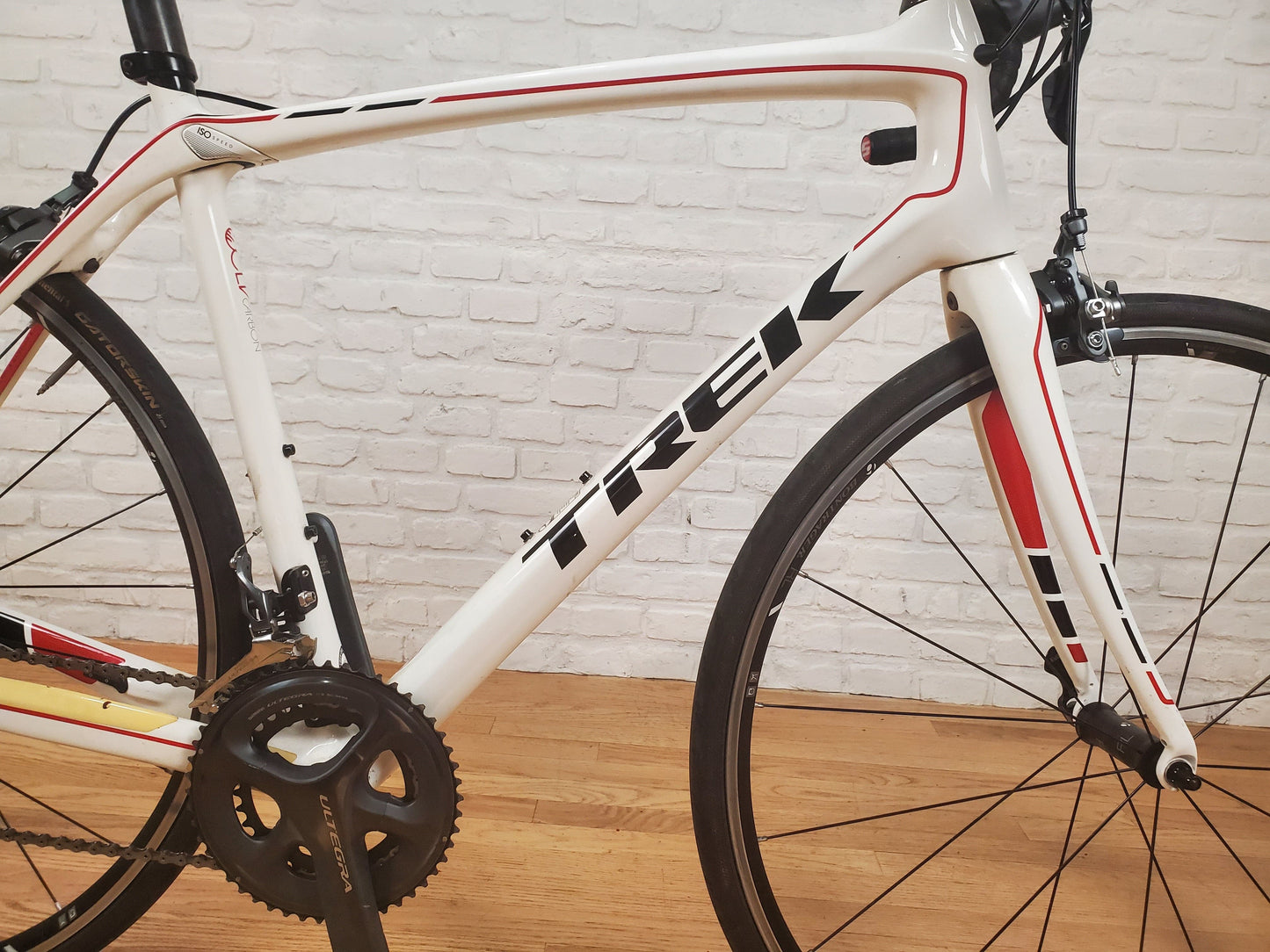 2014 Trek Domane 6.2 road bike. OCLV 600 series carbon fiber frame with endurance geometry and integrated carbon fiber seat post. Shimano Ultegra 2x11 mechanical groupset. Bontrager RL wheels with Gatorskin tires. 54cm frame for someone below 5'5. The bike is in very good mechanical and cosmetic condition.
