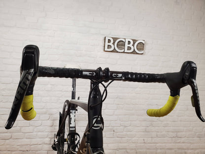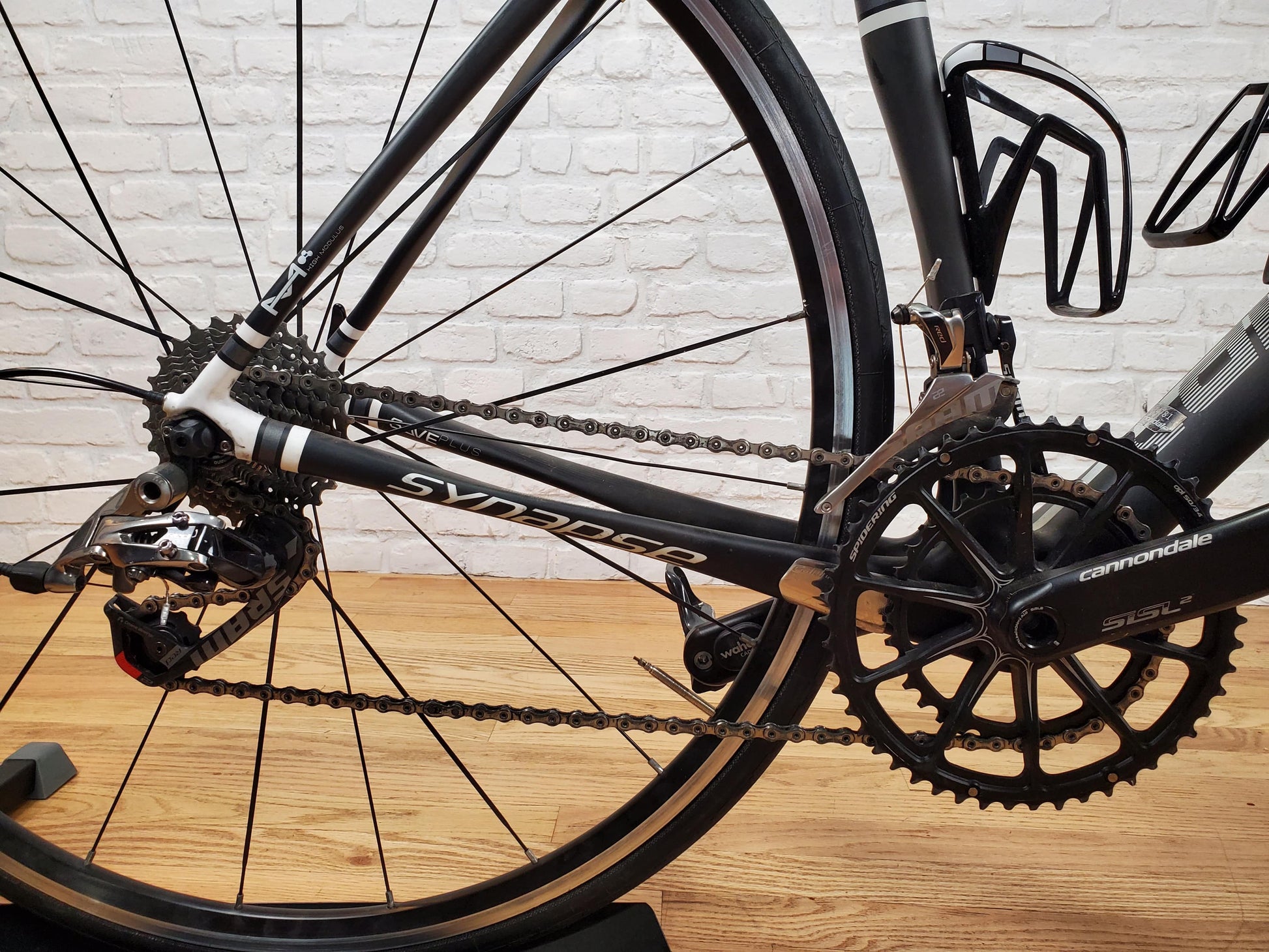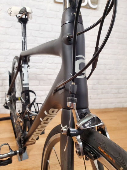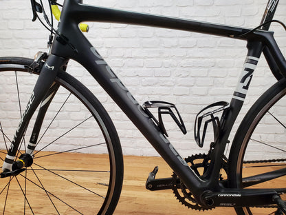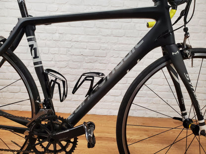 2015 Cannondale Synapse Hi Mod road bike. High Modulus Carbon fiber frame with endurance geometry. SRAM Red 2x11 mechanical groupset. SL-K carbon fiber seat post with Fizik Aliante saddle. Mavic Aksium wheels with Ultra Sport tires. 54cm frame for someone around 5'9. Weighs in at 17lbs. The bike is in very good mechanical and cosmetic condition.