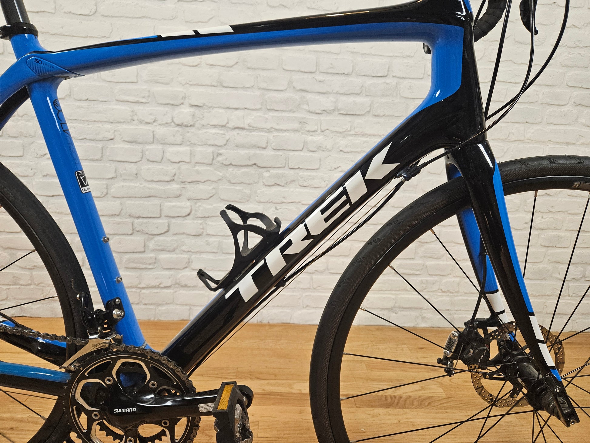 2015 Trek Domane 4.3 Disc road bike. 400 series OCLV carbon fiber frame with endurance geometry. Shimano 105 2x11 groupset with mechanical disc brakes. Bontrager TLR wheels with Gatorskin tires. 58cm frame for someone around 6 feet tall. The bike is in excellent mechanical and cosmetic condition.