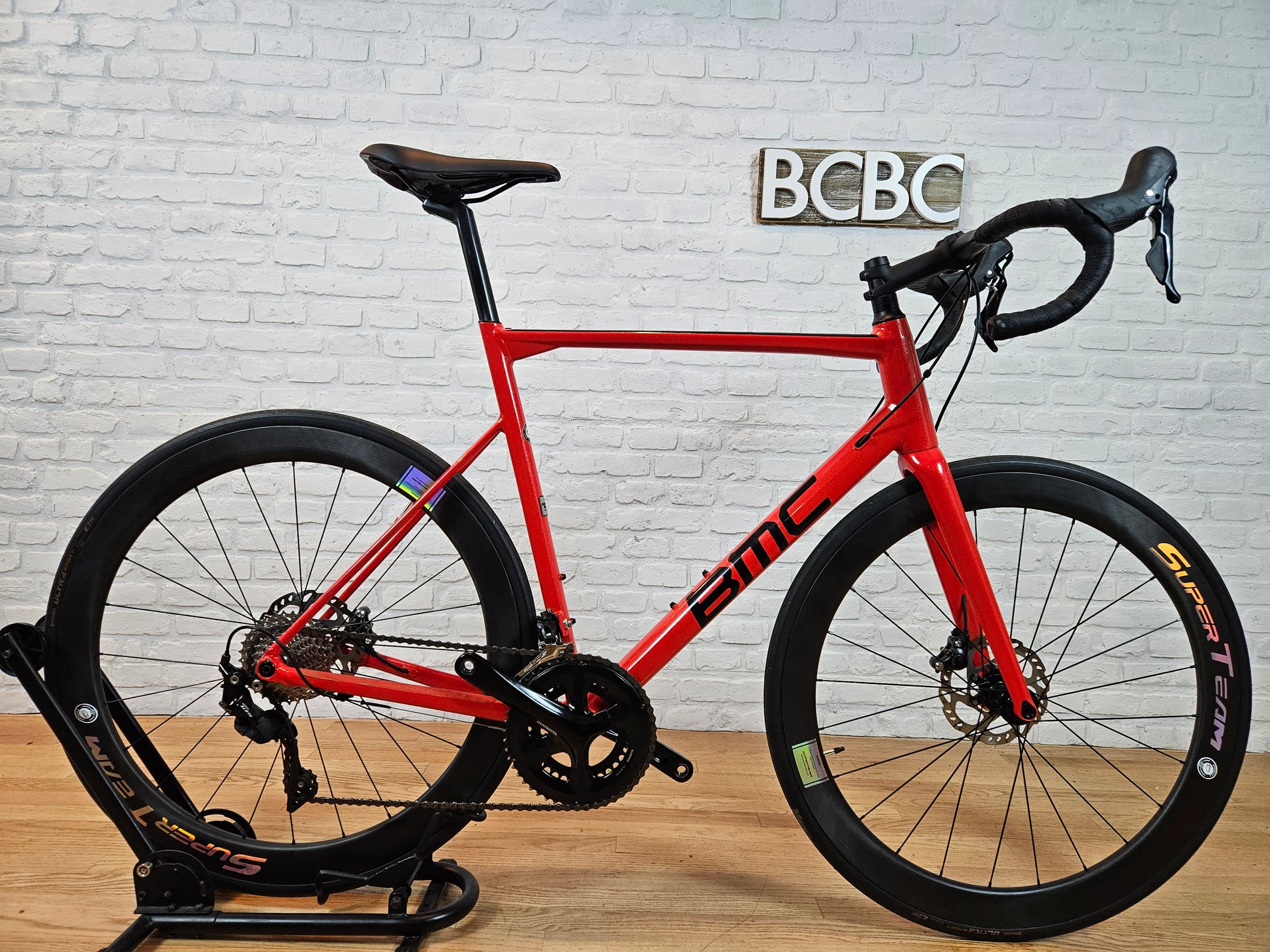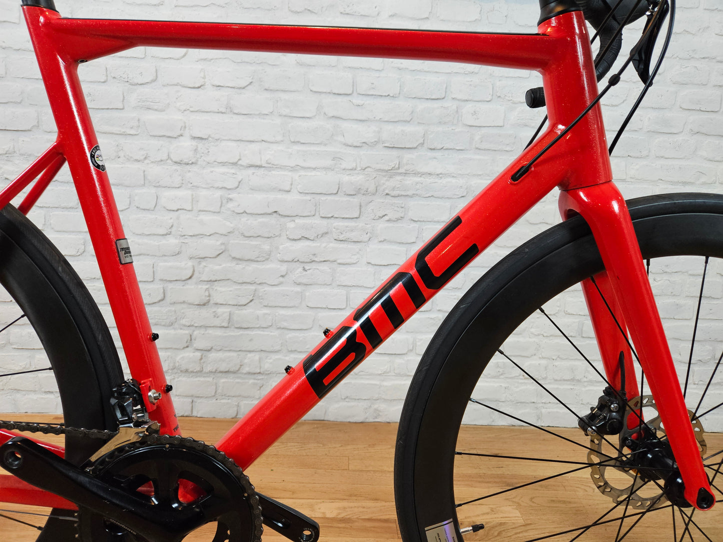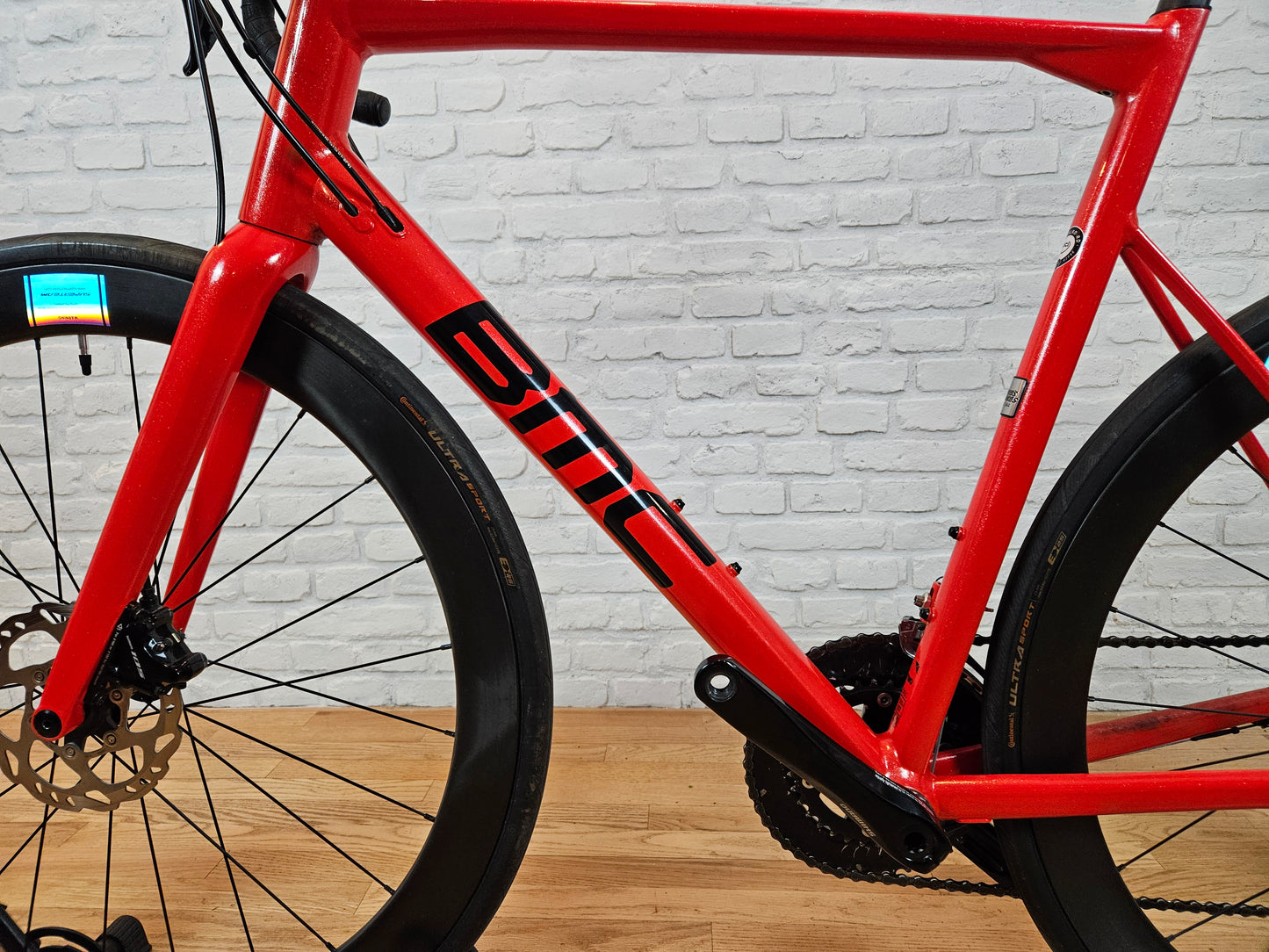 2021 BMC TeamMachine ALR TWO road bike. Aluminum frame and carbon fork with racing geometry. Shimano 105 2x11 groupset with Hydraulic disc brakes. SuperTeam carbon fiber deep section wheels wheels with Continental UltraSport tires. The bike is in excellent mechanical and cosmetic condition. 57cm frame for someone around 6 feet tall.