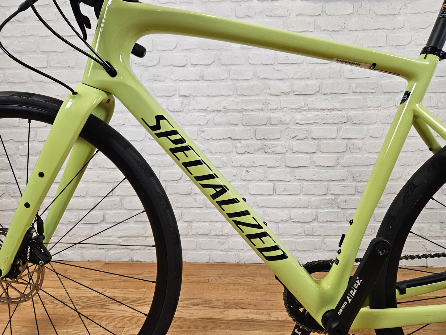 2022 Specialized Diverge Sport gravel bike. Carbon fiber frame with Futureshock 1.5. SRAM Apex 1x11 groupset with hydraulic disc brakes. Carbon fiber seat post with Specialized Power saddle. DT Swiss G540 wheels with Continental GrandPrix 500 32mm tires. 58cm frame for riders around 6. The bike is in excellent mechanical and cosmetic condition aside from a small pain chip on the top tube (see last pic).