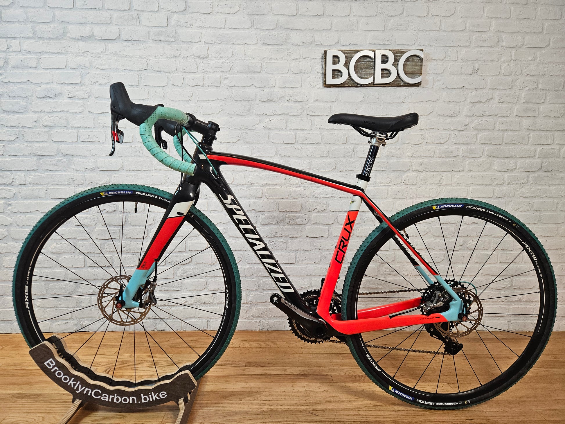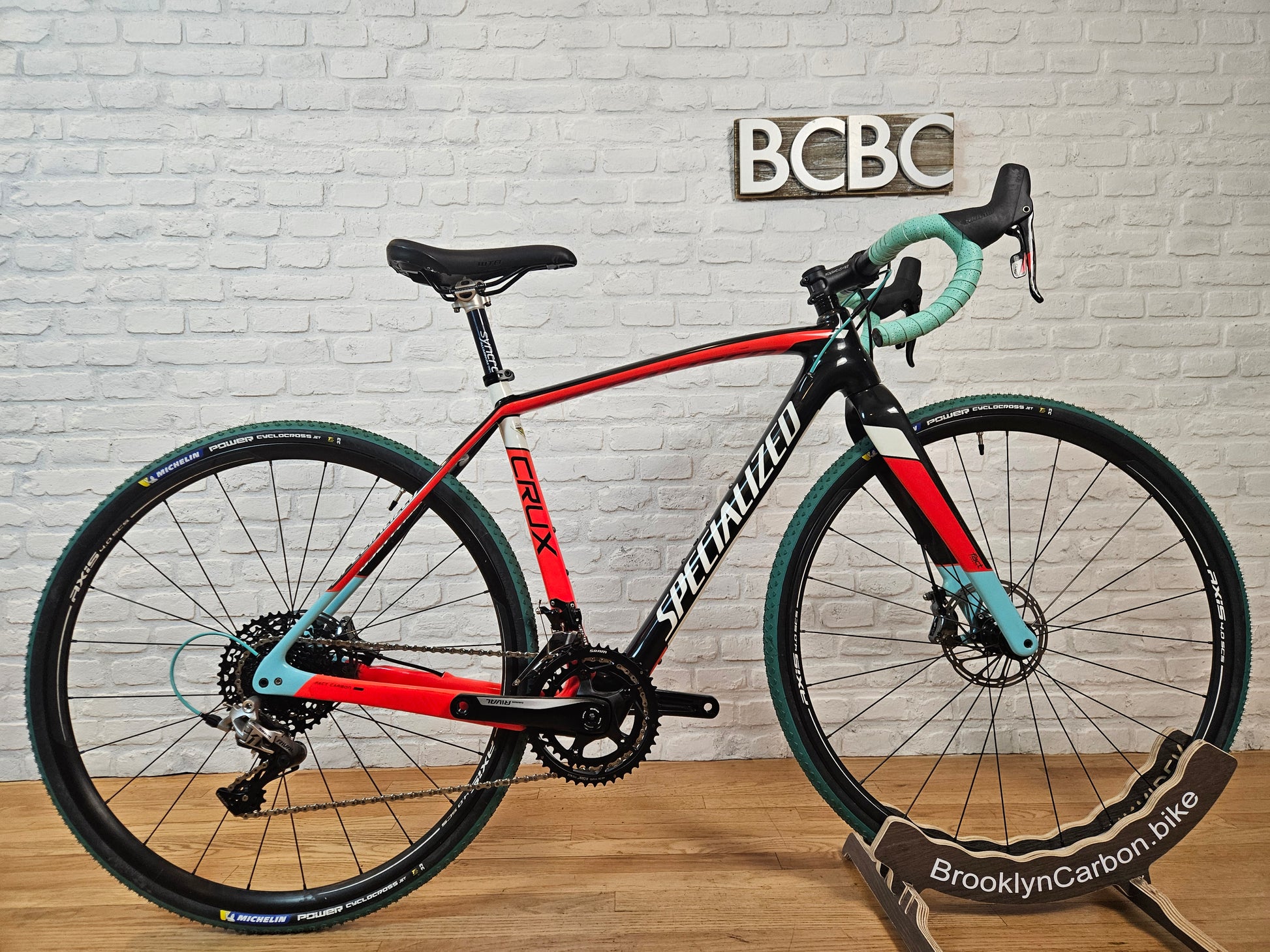 2016 Specialized Crux Expert gravel/cyclocross bike. Fact 10r carbon fiber frame. A mix of SRAM Rival 2x11 groupset with SRAM Force hydraulic disc brakes and SRAM Red shifters. Axis Sport 4.0 SES wheels with Michelin Power Cyclocross 33mm tires. Syncros seat post with WTB Volt saddle and Easton stem. The bike is in very good mechanical and cosmetic condition with a paint chip on the non drive side of the fork (see last pic). 52cm frame for someone around 5'6.