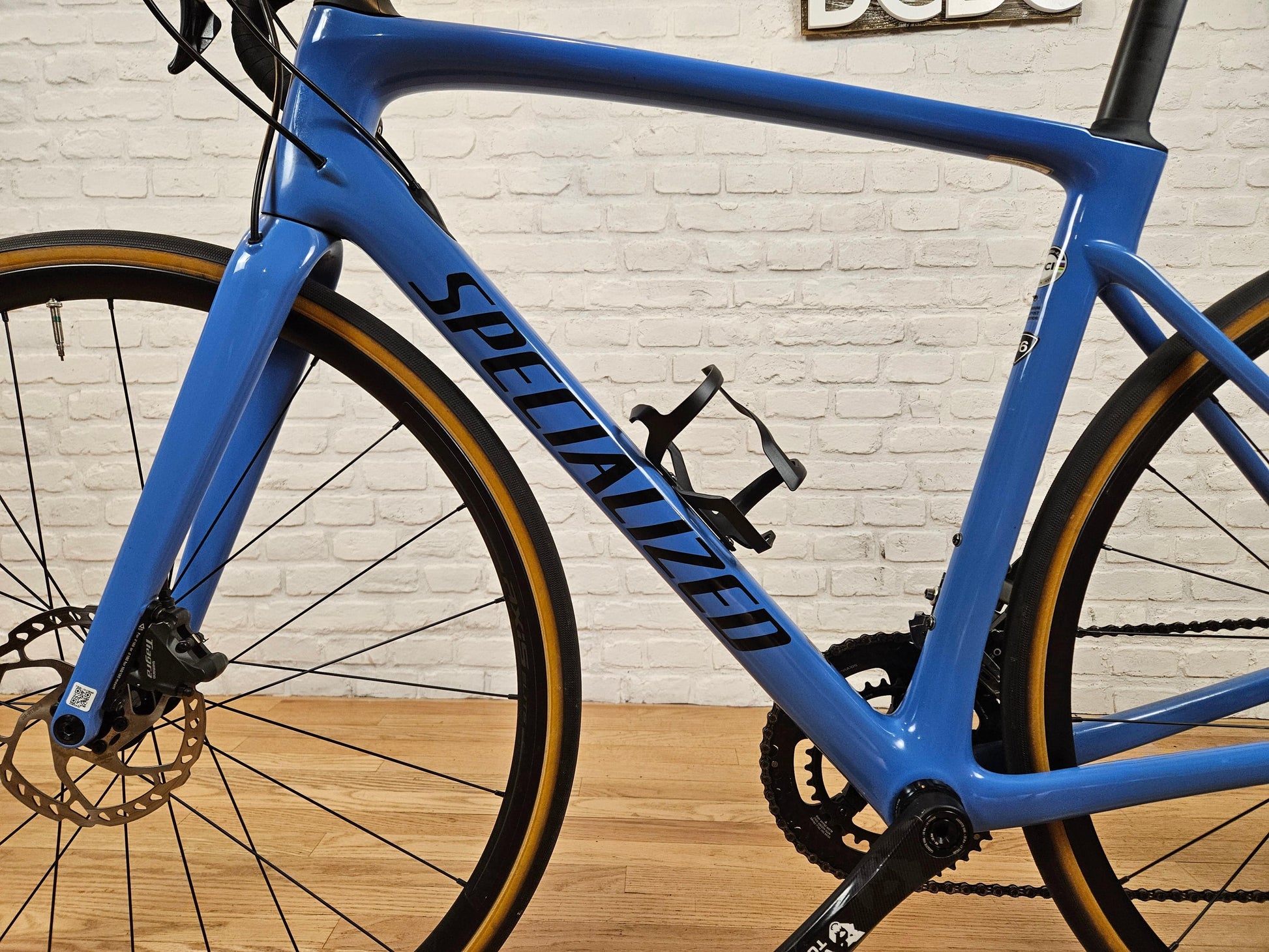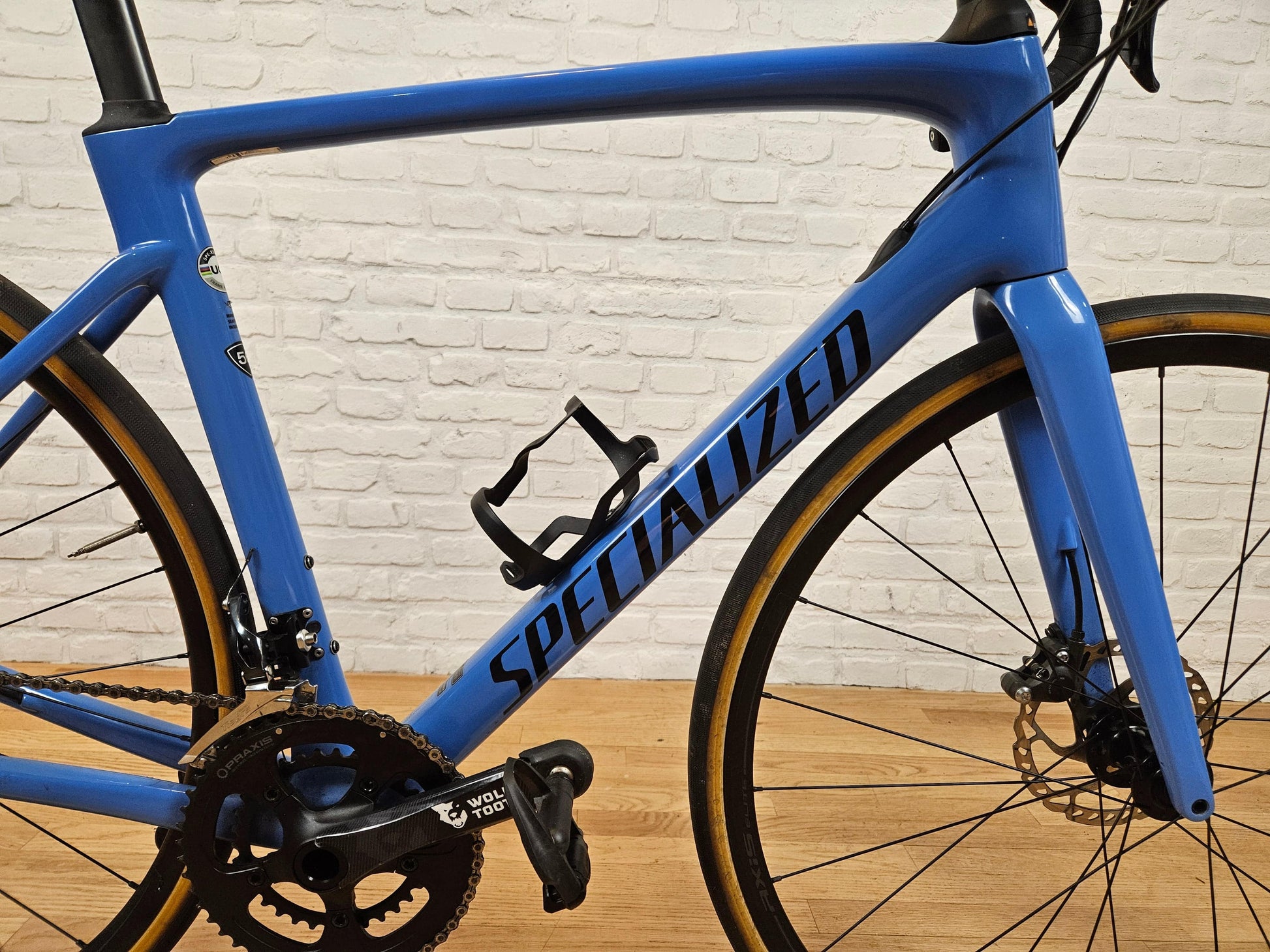2021 Specialized Roubaix Comp Disc road bike. Fact 10r carbon fiber frame with endurance geometry and Futureshock 1.5. Shimano Tiagra 2x10 groupset with hydraulic disc brakes. Pave carbon fiber seat post with Bontrager Versa Elite saddle. Axis Elite wheels with Turbo Cotton 28mm tires. 56cm frame for someone around 5'11 feet. The bike is in excellent mechanical and cosmetic condition aside from small paint blemish on the non drive side chain stay (see last pic).